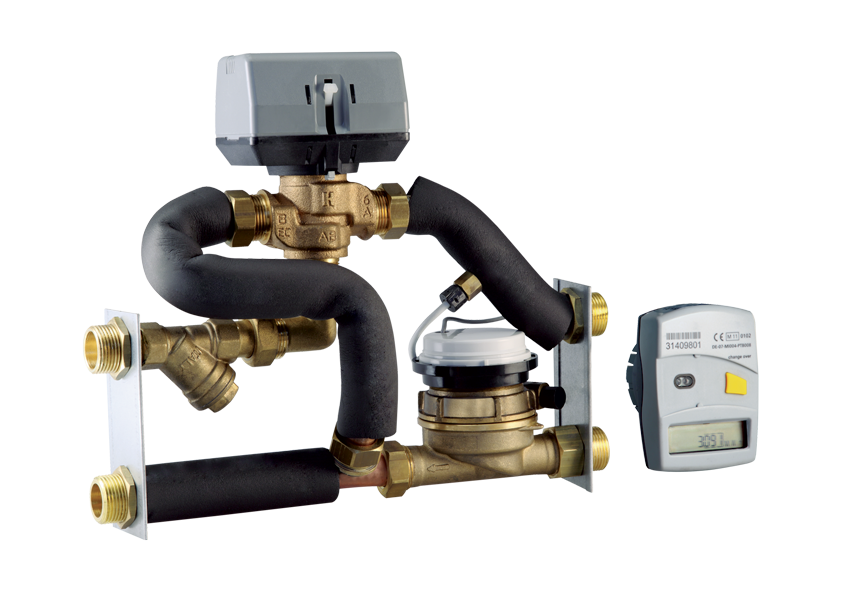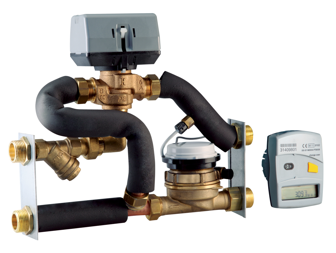 Contabilizzatore di energia per impianti sia per climatizzazione invernale che estiva, comprensivo di valvola tre vie deviatrice.