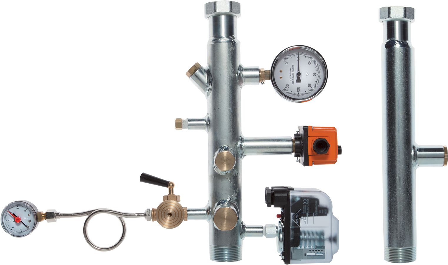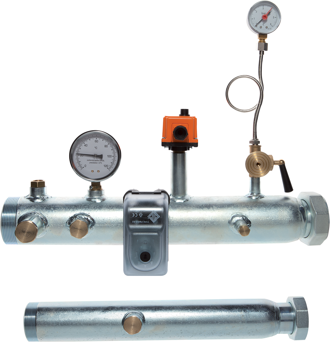 Comprensivo di termometro, pozzetto porta-termometro, termostato di blocco a riarmo manuale, rubinetto porta-manometro, manometro, pressostato a riarmo manuale, pozzetto per valvola intercettazione combustibile, attacco per pressostato di minima e attacco per vaso d'espansione.