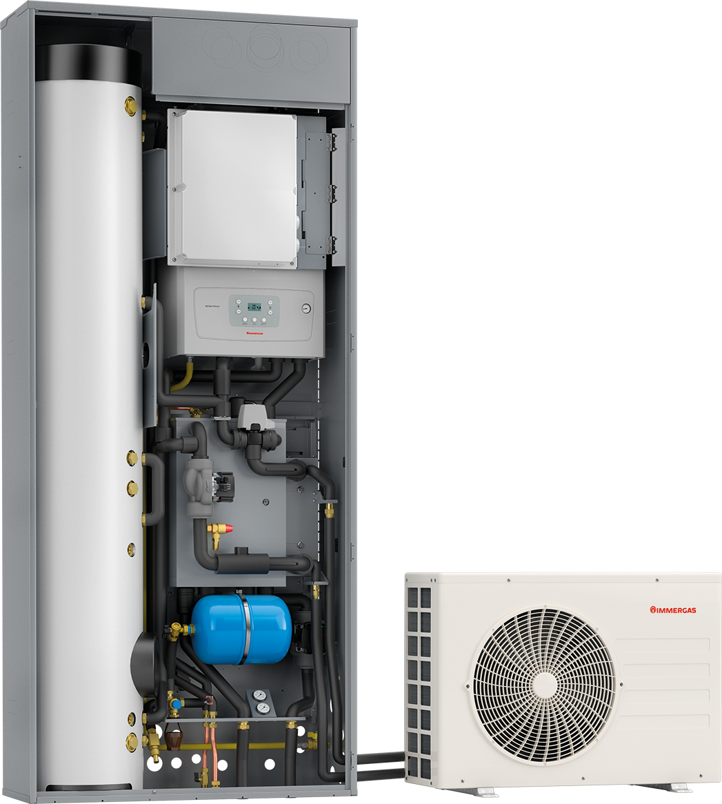 • Domestic hot water production with storage tank unit managed by both the heat pump and the internal condensation unit;