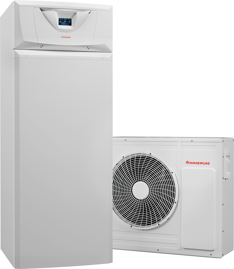 Monobloc reversible air-to-water inverter driven heat pump system composed by an external unit and a floor standing internal unit