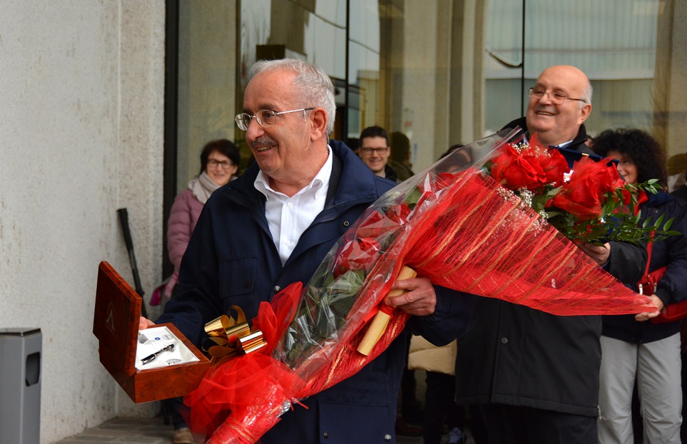 C'erano proprio tutti; quasi 600 dipendenti che anno portato a Romano Amadei un augurio caloroso e gioioso attraverso la consegna di una targa d'argento sulla quale sono incise parole di stima e affetto sincero: