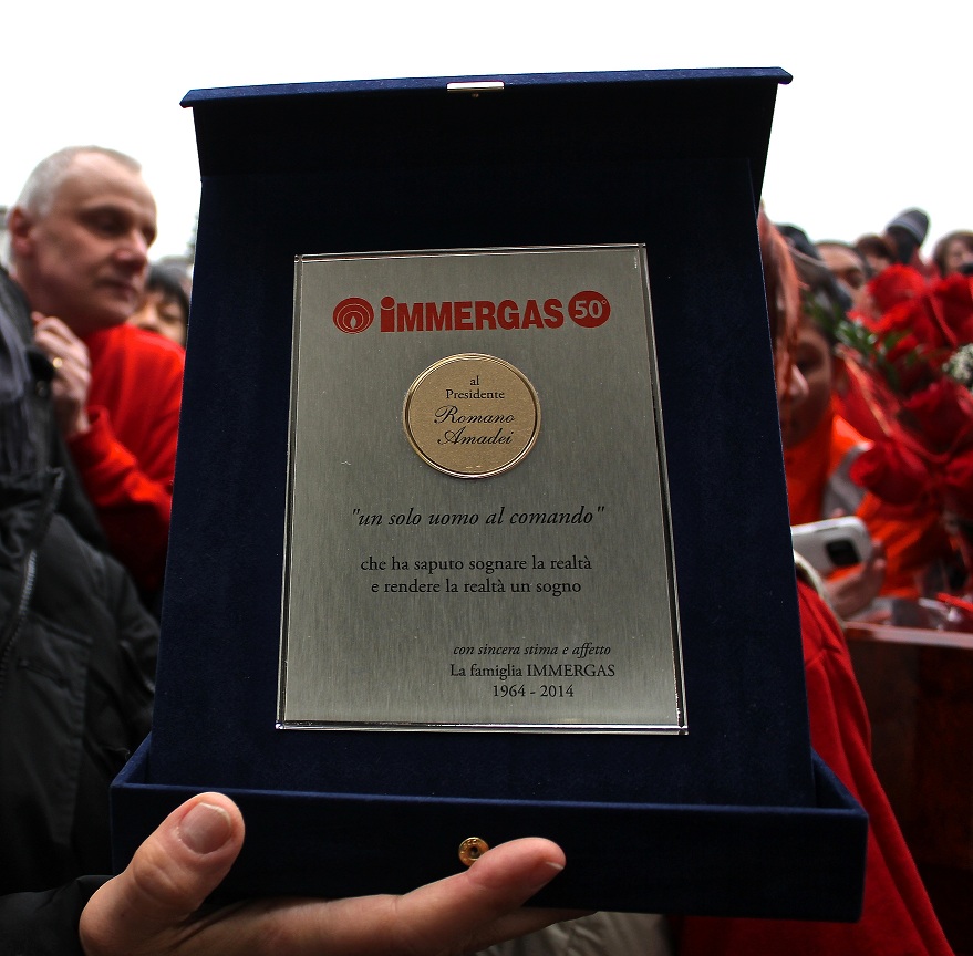 "Un uomo solo al comando... che ha saputo sognare la realtà e rendere la realtà un sogno" seguite dall' eloquente firma "la Famiglia Immergas 1964-2014".