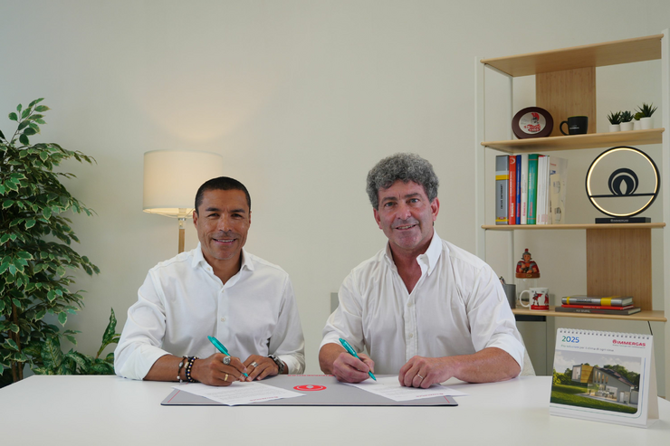 In foto: Alfredo Amadei, Presidente Immerfin e Ivan Córdoba, brand ambassador Immergas, firmano l’accordo di partnership.