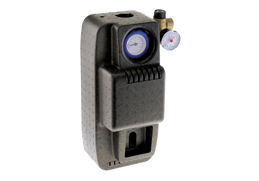 - GRUPPO DI CIRCOLAZIONE SINGOLO A BASSO CONSUMO con valvola di sicurezza 6 bar e regolatore di portata (1-6 l/min), con relativo kit di collegamento