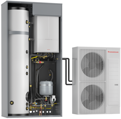 Pompa di calore ibrida splittata monofase da incasso o in armadio tecnico, con bollitore integrato da 250 litri.