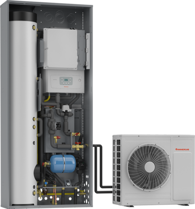 Pompa di calore ibrida monoblocco, da incasso o in armadio tecnico, con bollitore integrato da 160 litri.