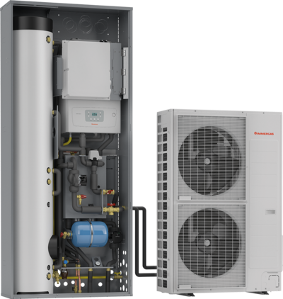 Pompa di calore ibrida monoblocco, da incasso o in armadio tecnico, con bollitore integrato da 160 litri.